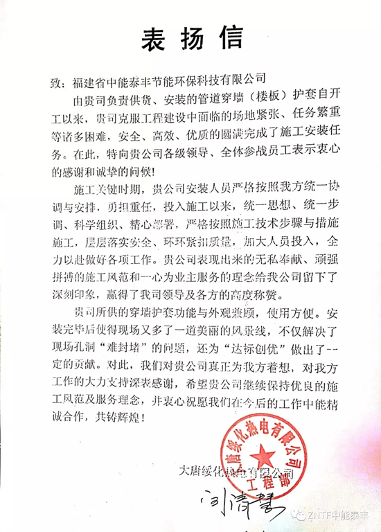 信中提到,中能泰豐所供的管道穿墻(樓板)護(hù)套不僅解決了現(xiàn)場孔洞“難封堵”的問題,還為“達(dá)標(biāo)創(chuàng)優(yōu)”做出了一定的貢獻(xiàn),功能與外觀兼顧,使用方便,安裝后將是現(xiàn)場的一道美麗的風(fēng)景線。