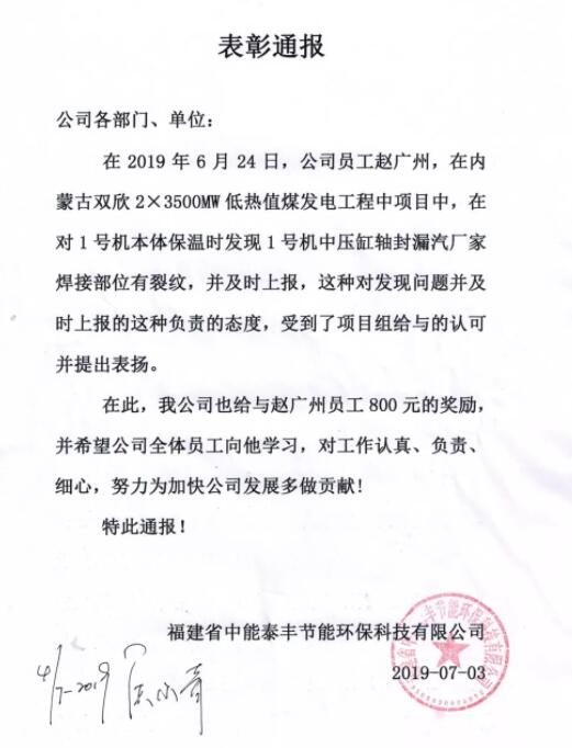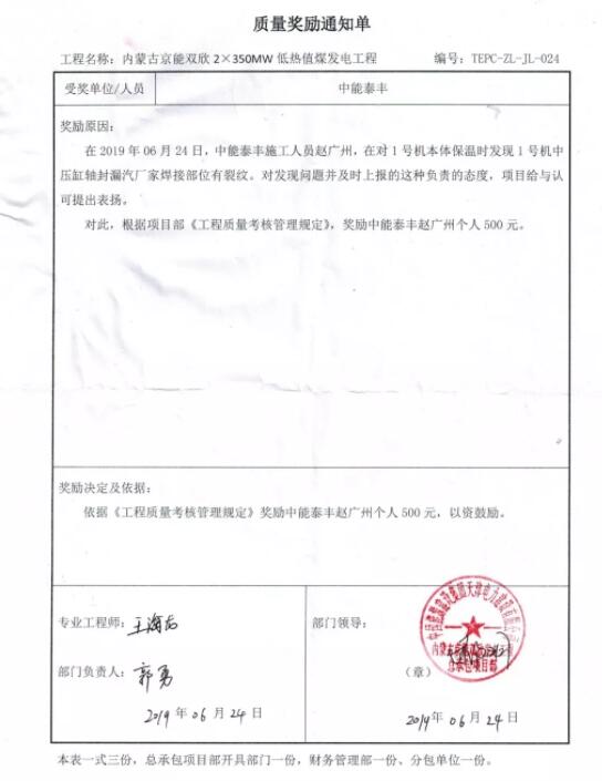 近日,福建省中能泰豐節(jié)能環(huán)?萍加邢薰臼盏街袊(guó)能源建設(shè)集團(tuán)內(nèi)蒙古京能雙欣2*350MW低熱值煤發(fā)電工程發(fā)來(lái)的“質(zhì)量獎(jiǎng)勵(lì)通知單”。該通知,是表?yè)P(yáng)獎(jiǎng)勵(lì)中能泰豐公司施工人員趙廣州在對(duì)1號(hào)本體保溫時(shí)發(fā)現(xiàn)1號(hào)機(jī)中壓缸軸封漏汽廠家焊接部位有裂紋,對(duì)發(fā)現(xiàn)問(wèn)題并及時(shí)上報(bào)的這種負(fù)責(zé)態(tài)度,給予認(rèn)可提出表?yè)P(yáng)并根據(jù)項(xiàng)目部《工程質(zhì)量考核管理規(guī)定》獎(jiǎng)勵(lì)趙廣州500元,以資鼓勵(lì)。